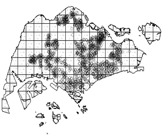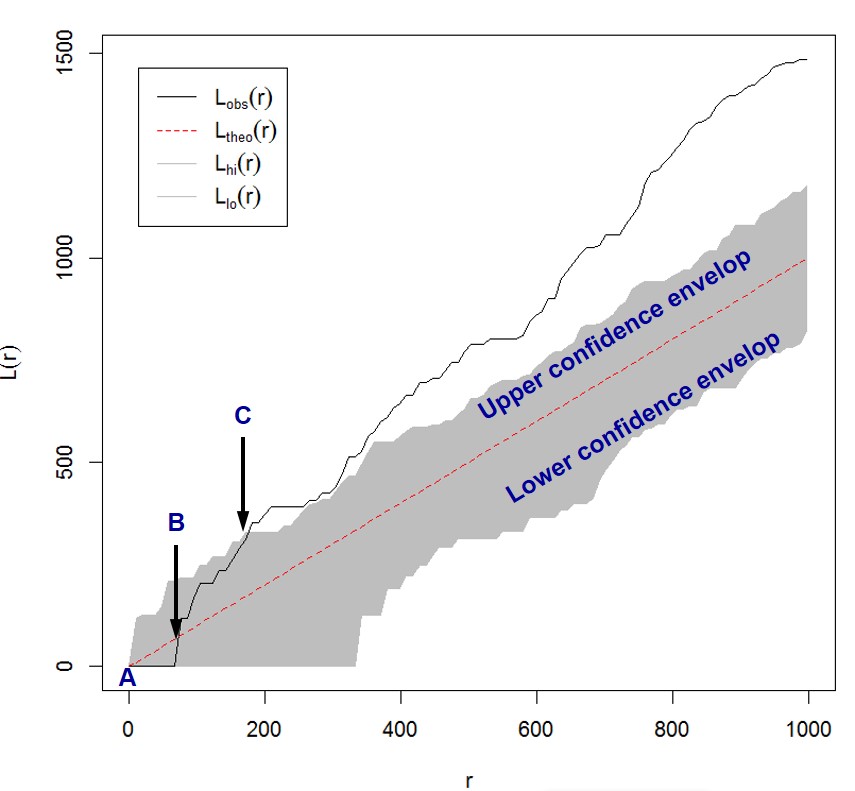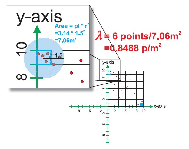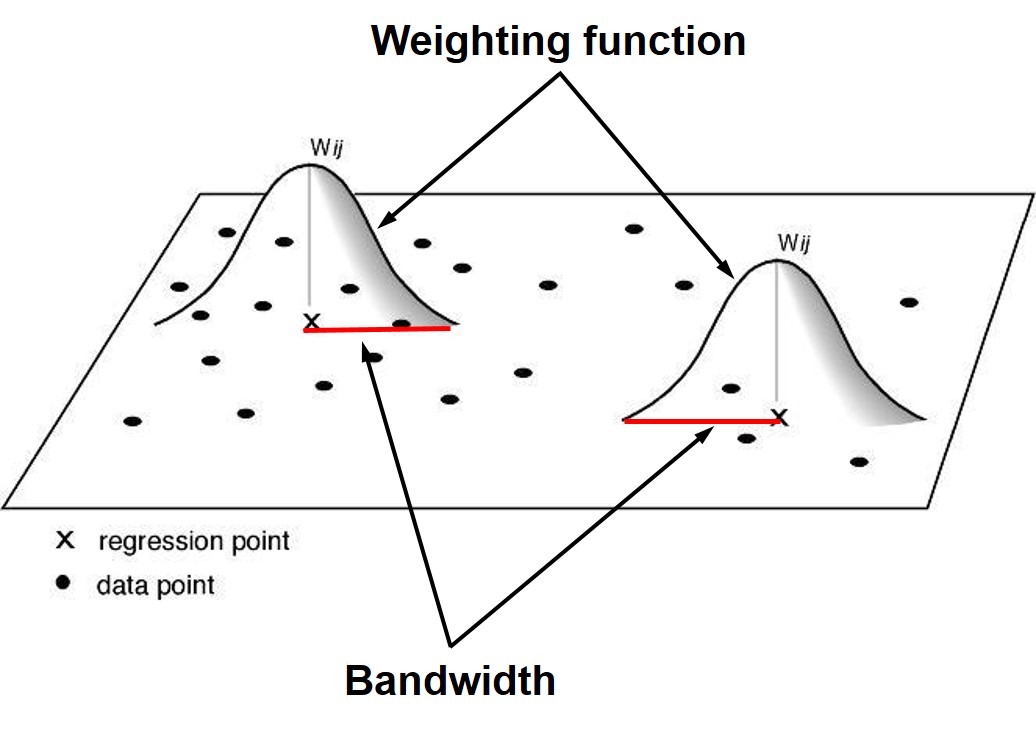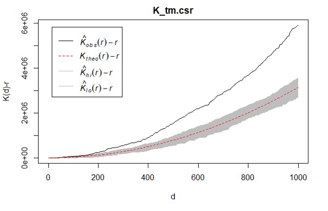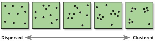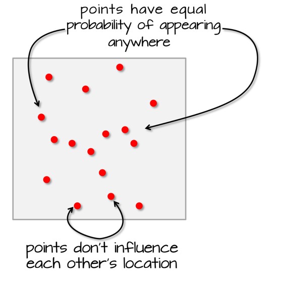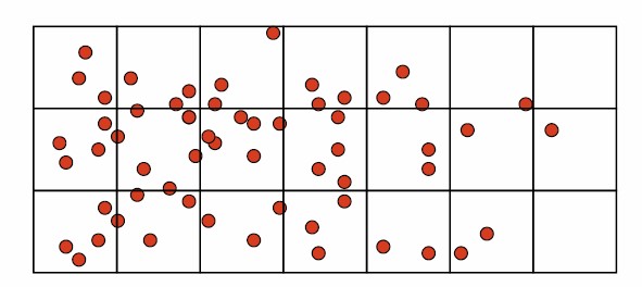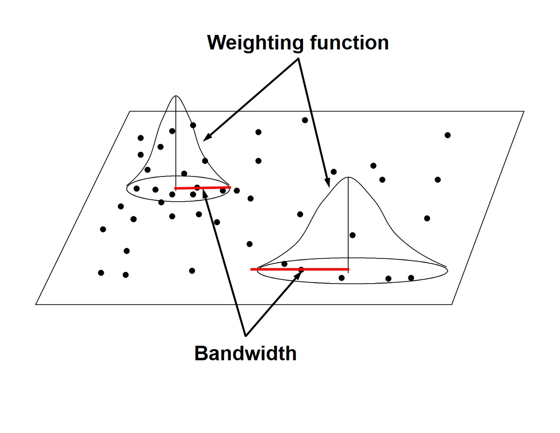 Singapore Management University ### 2020-5-5 (updated: 2021-05-17) --- # Content .large[ - Introducing Spatial Point Patterns - The basic concepts of spatial point patterns - 1st Order versus 2nd Order - Spatial Point Patterns in real world - 1st Order Spatial Point Patterns Analysis - Quadrat analysis - Kernel density estimation - 2nd Order Spatial Point Patterns Analysis - Nearest Neighbour Index - G-function - F-function - K-function - L-function ] --- # What is Spatial Point Patterns .large[ - Points as Events - Mapped pattern - Not a sample - Selection bias - Events are mapped, but non-events are not ] --- ## Spatial Point Patterns in Real World .large[ - Distribution of dieses such as dengue fever.] .center[ ] --- ## Spatial Point Patterns in Real World .large[ - Distribution of car collisions.] .center[ ] --- ## Spatial Point Patterns in Real World .large[ - Distribution of crime incidents.] .center[ ] --- ## Spatial Point Patterns in Real World .large[ - Distribution of public services such as education institutions.] .center[ ] --- ## Spatial Point Patterns in Real World .large[ - Locations of the different channel stores.] .center[ ] --- ## Spatial Point Patterns in Real World .large[ - Distribution of social media data such as tweets.] .center[ ] --- # Real World Question .large[ - Location only - are points randomly located or patterned - Location and value - marked point pattern - is combination of location and value random or patterned - What is the underlying process? ] --- ## Points on a Plane .large[ - Classic point pattern analysis - points on an isotropic plane - no effect of translation and rotation - classic examples: tree seedlings, rocks, etc - Distance - straight line only] --- ## Real world spatial point patterns .large[ - Is this a random distribution?] .center[ ] --- ## Real world spatial point patterns .large[ - Is this a random distribution?] .center[ ] --- # Spatial Point Patterns Analysis .large[ - Point pattern analysis (PPA) is the study of the spatial arrangements of points in (usually 2-dimensional) space. - The simplest formulation is a set X = {x ∈ D} where D, which can be called the **study region**, is a subset of Rn, a n-dimensional **Euclidean space**. - A fundamental problem of PPA is inferring whether a given arrangement is merely **random** or the result of some process.] .center[ ] --- # Spatial Point Patterns Analysis Techniques .large[ - First-order vs Second-order Analysis of spatial point patterns.] .center[ ] .small[Reference: 11.4 First and second order effects of Intro to GIS and Spatial Analysis (https://mgimond.github.io/Spatial/point-pattern-analysis.html#first-and-second-order-effects) ] ??? The first-order properties describe the way in which the expected value (mean or average) of the spatial point pattern varies across space (i.e., the intensity of the spatial point pattern). Such properties are usually measured with the so-called quadrat analysis, nearest neighbour index and kernel estimation. Second-order properties describe the covariance (or correlation) between values of the spatial point pattern at different regions in space and are usually measured with the G function, K function and L function. Applied to point event data, both properties could be used to explore the spatial variation in the risk of being victimized by a crime, spatial and space-time clustering of criminal activities, and the raised incidence of criminal activities around point sources, such as robberies around ATM machines, subway entrances and exits, etc. --- ## First-order Spatial Point Patterns Analysis Techniques .large[ - Density-based - Quadrat analysis, - Kernel density estimation - Distance-based - Nearest Neighbour Index ] --- ## Basic concept of density-based measures .center[ ] --- ### Quadrat Analysis – Step 1 .large[ - Divide the study area into subregion of equal size, - often squares, but don’t have to be.] .center[ ] --- ### Quadrat Analysis – Step 2 .large[ - Count the frequency of events in each region.] .center[ ] --- ### Quadrat Analysis – Step 3 .large[ - Calculate the intensity of events in each region.] .center[ ] --- ### Quadrat Analysis – Step 4 .large[ - Calculate the quadrat statistics and perform CSR test.] .center[ ] --- ### Quadrat Analysis – Variance-Mean Ratio (VMR) .large[ - For an **uniform** distribution, the variance is zero, - therefore, we expect a variance-mean ratio **close to 0**. - For a **random** distribution, the variance and mean are the same, - therefore, we expect a variance-mean ratio **close to 1**. - For a **cluster** distribution, the variance is relatively large, - therefore, we expect a variance-mean ratio **greater than 1**.] --- ### Complete Spatial Randomness (CSR) .pull-left[ .large[ - CSR/IRP satisfy two conditions: - Any event has equal probability of being in any location, a **1st order** effect. - The location of one event is independent of the location of another event, a **2nd order** effect. ] .small[Reference: Source: Chapter 12 Hypothesis testing of Intro to GIS and Spatial Analysis (https://mgimond.github.io/Spatial/hypothesis-testing.html) ]] .pull-right[ ] --- ### Quandrat Analysis: The interpretation .center[ ] --- ### Weaknesses of quadrat analysis .pull-left[ .large[ - It is sensitive to the quadrat size. - If the quadrat size is too small, they may contain only a couple of points, and - If the quadrat size is too large, they may contain too many points. - It is a measure of **dispersion** rather than a measure of **pattern**. - It results in a single measure for the entire distribution, so variation within the region are not recognised.]] .pull-right[ ] --- ## Distance-based: Nearest Neighbour Index ### What is Nearest Neighbour? .large[ Direct distance from a point to its nearest neighbour.] .center[ ] --- ## Nearest Neighbour Index .large[ The Nearest Neighbour Index is expressed as the ratio of the **Observed Mean Distance** to the **Expected Mean Distance**.] .cen